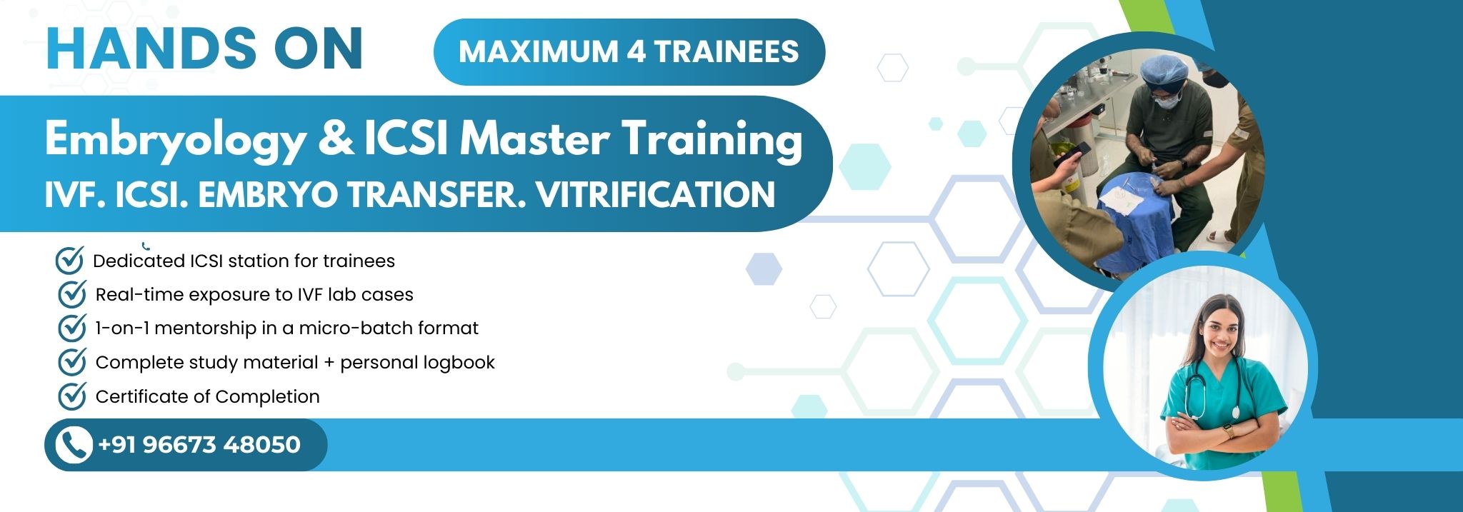 Our programs are designed for medical graduates, embryologists, gynecologists, and healthcare professionals seeking specialized skills in IVF, embryology, and ART (Assisted Reproductive Technology).